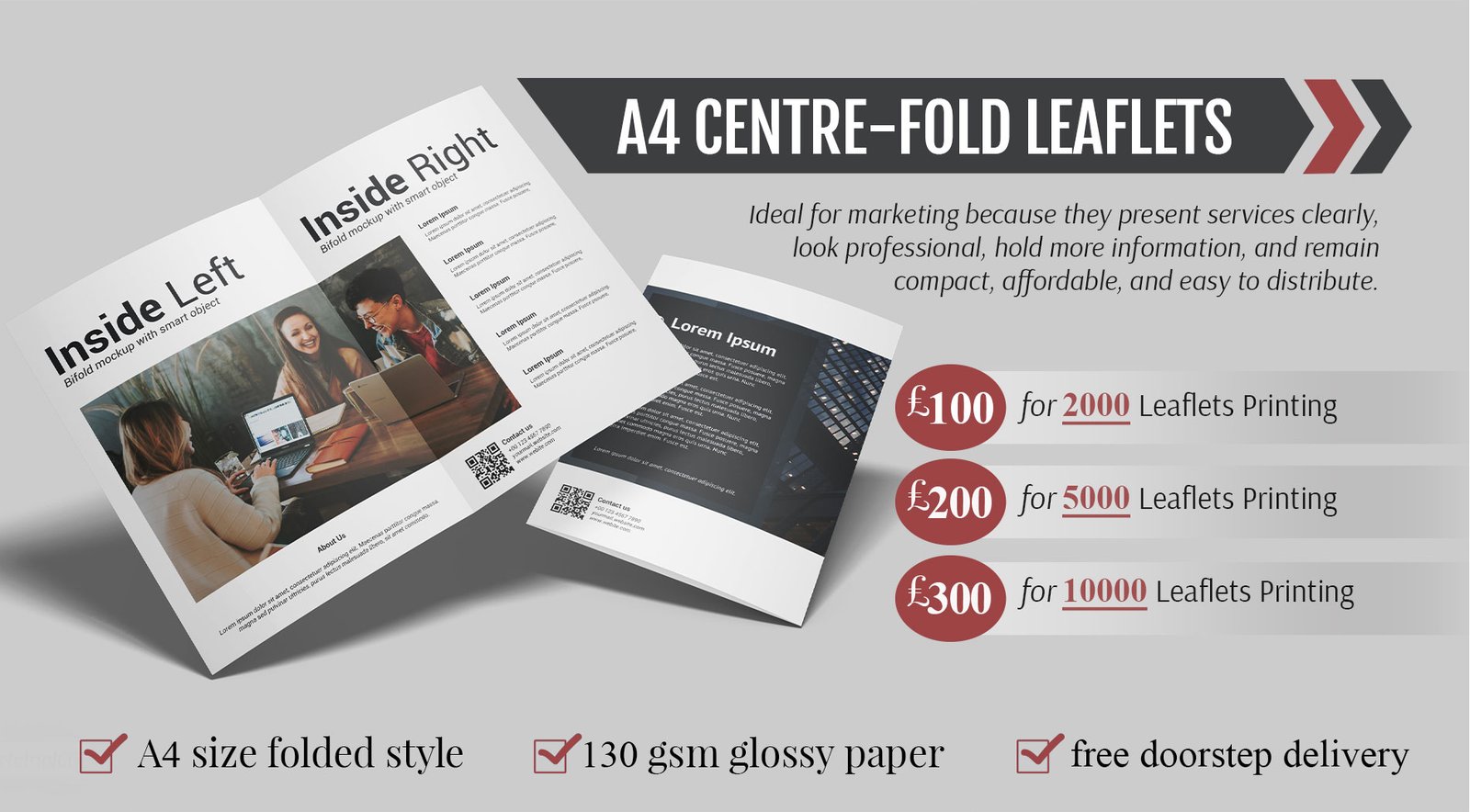 Ready to showcase your brand with style? At London Printers, we specialise in flyer and leaflet printing that combines quality, speed, and value. Our A4 centre-fold leaflets are designed to help you share your message clearly whether you’re promoting an event, presenting a menu, or creating a professional company brochure.